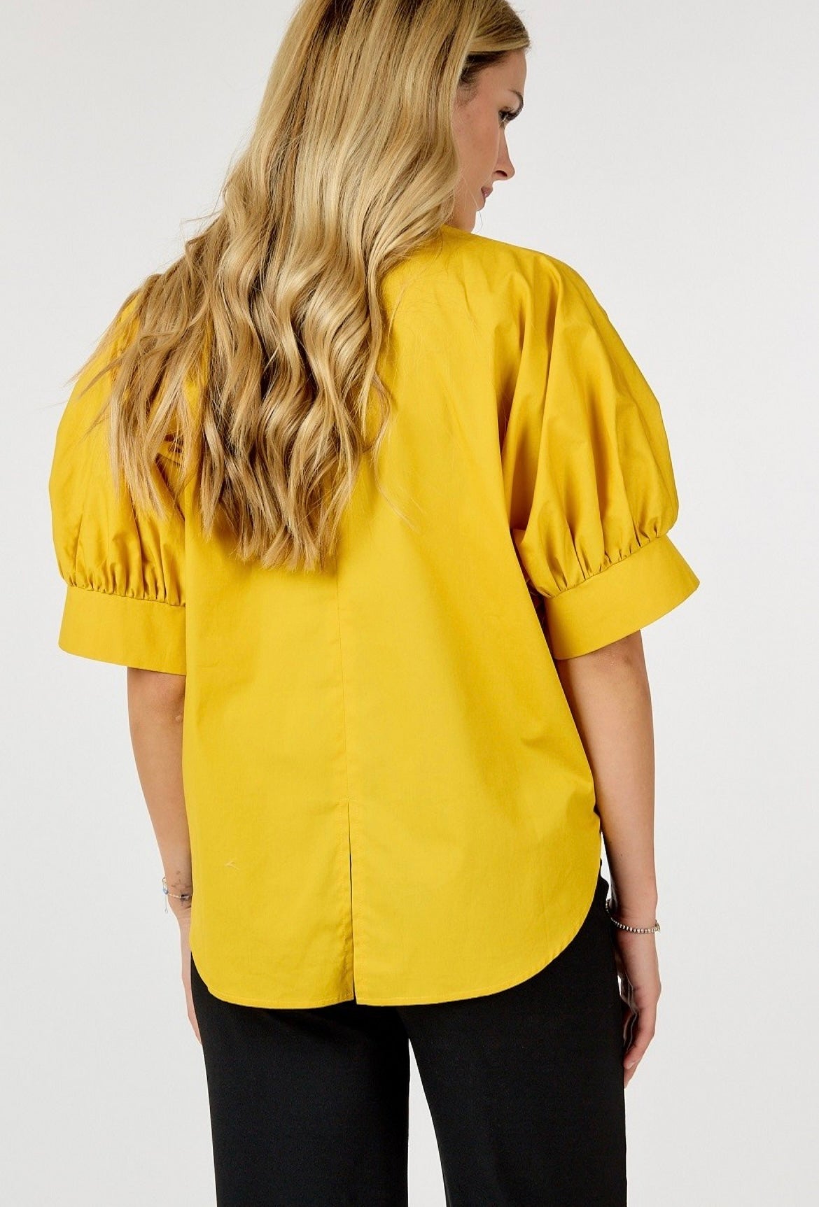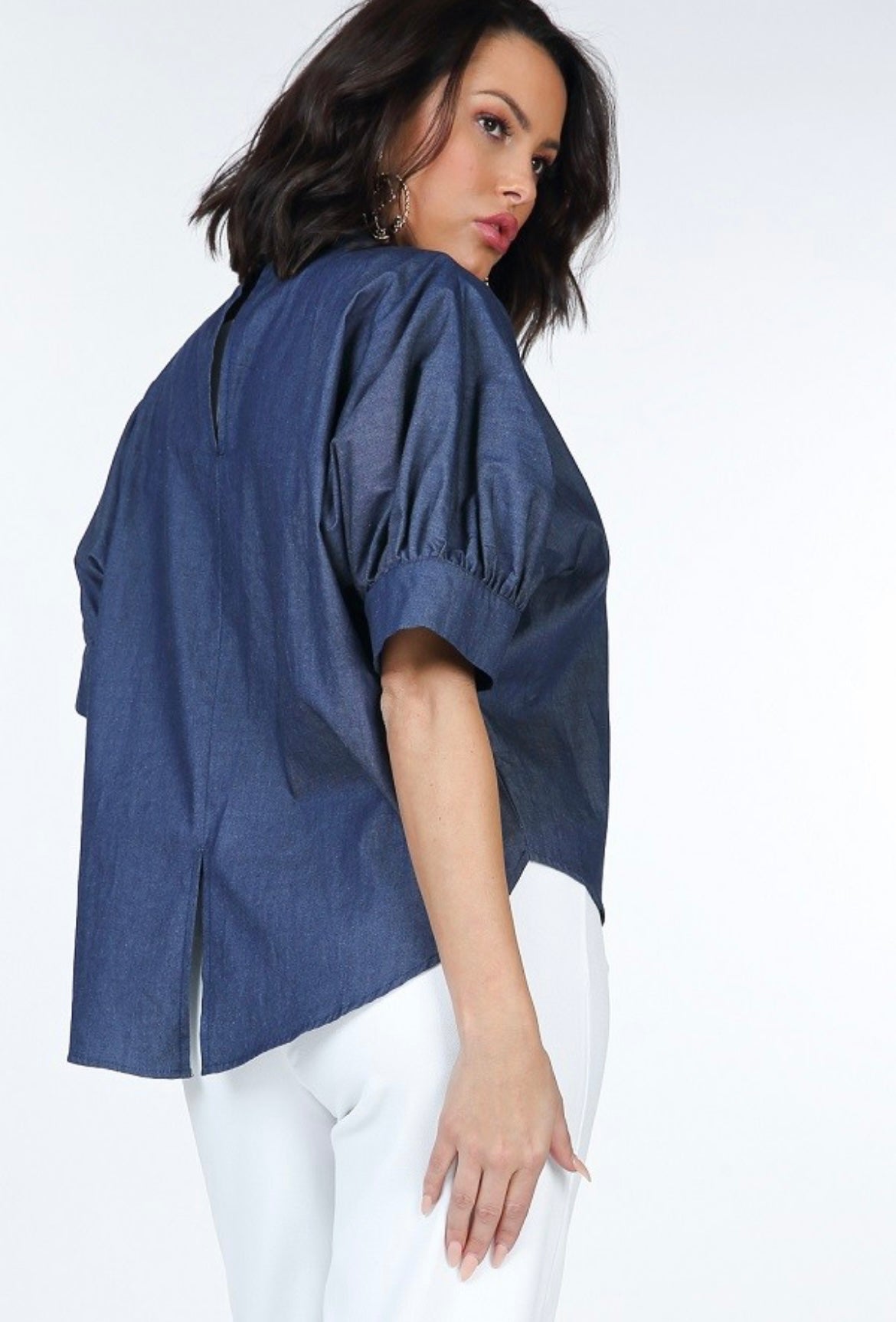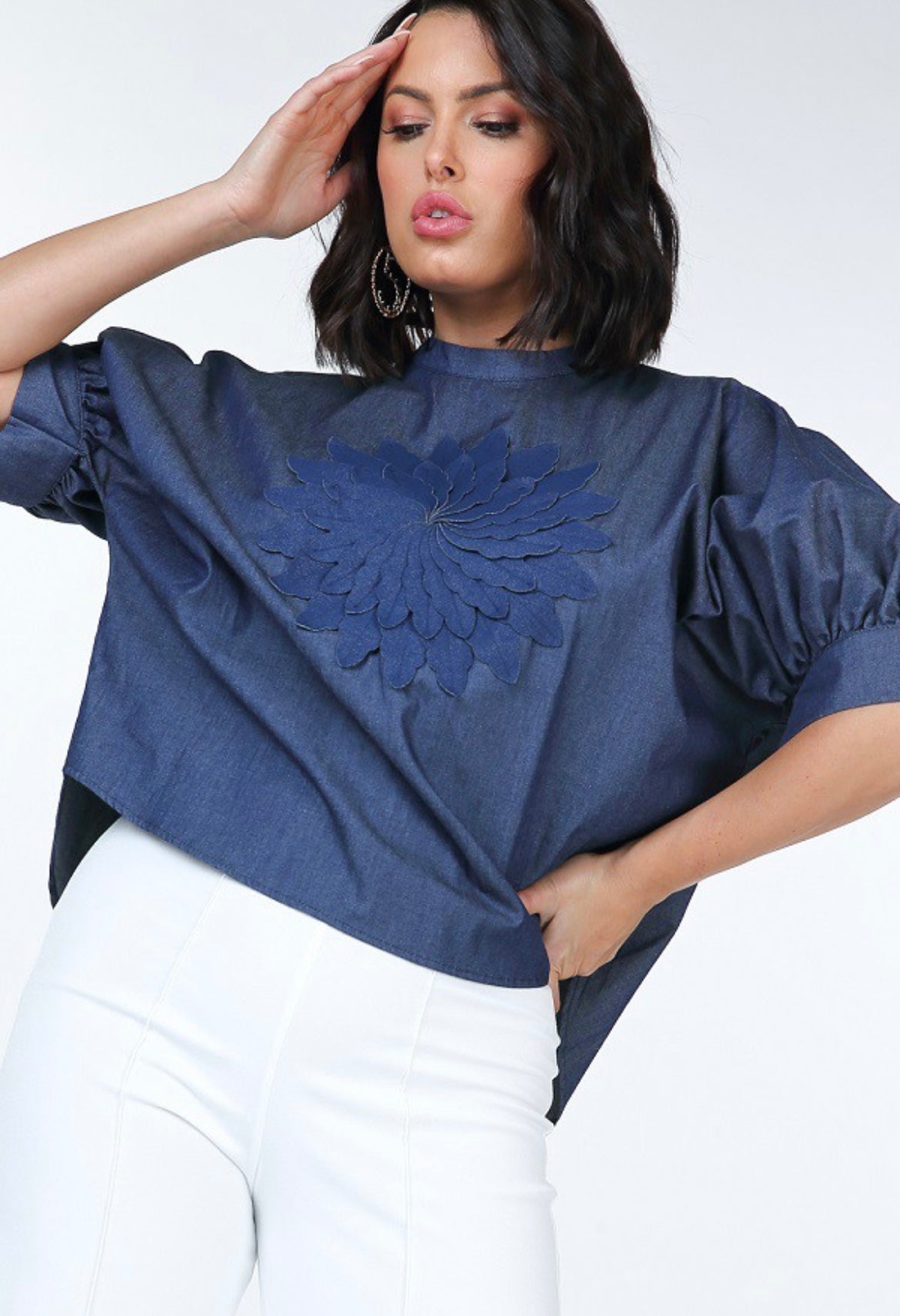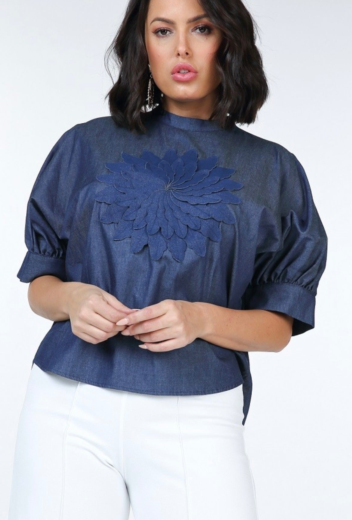 Half, puff sleeve, flower patch on front, hilo, back slits